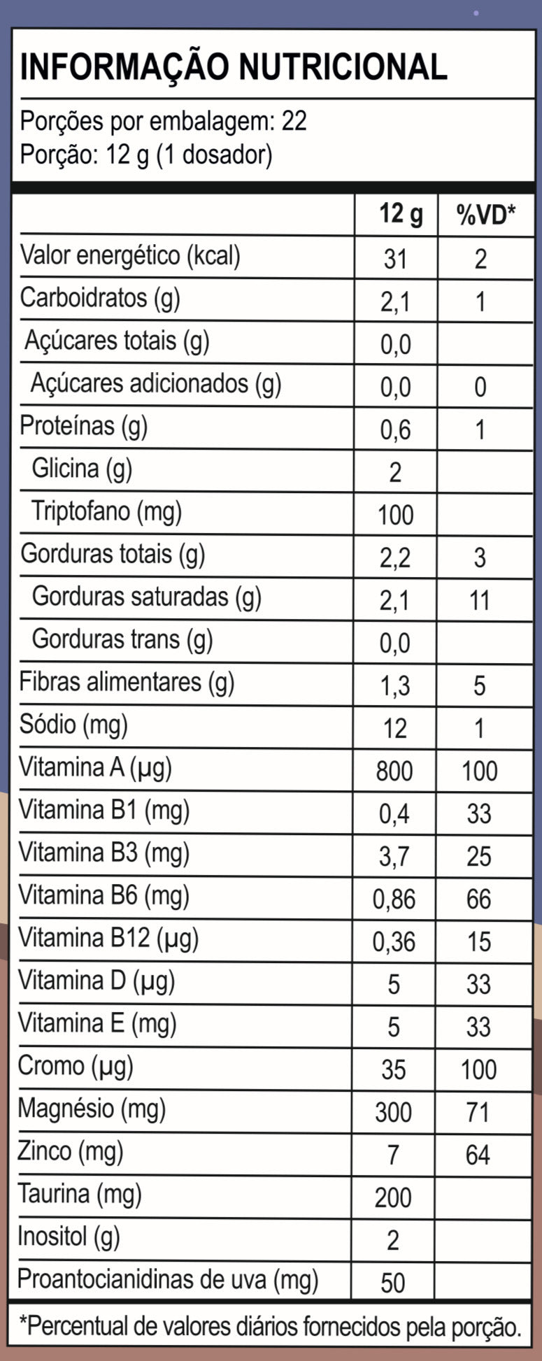 Triglicerídeos de cadeia média C8 + C10 (TCM), Glicina, Inositol, Cacau em Pó Alcalino, Carbonato de Magnésio, Inulina Obtida da Raiz de Chicória, Taurina, L-Triptofano, Sais de Magnésio de Ácido Cítrico, Extrato Seco de Semente de Uva, Acetato de dl-alfa-tocoferila (Vitamina E), Complexo de Vitaminas B (Tiamina (Vitamina B1), Nicotinamida (Vitamina B3), Piridoxina (Vitamina B6), Cianocobalamina (Vitamina B12)), Zinco Quelado (Bisglicinato de zinco), Acetato de retinol (Vitamina A), Picolinato de cromo, Colecalciferol (Vitamina D), Espessantes: Goma Acácia e Xantana. Edulcorante Glicosídeos de Esteviol de Stevia Rebaudiana Bertoni e Aromatizantes. ALÉRGICOS: CONTÉM DERIVADOS DE LEITE E SOJA. NÃO CONTÉM GLÚTEN